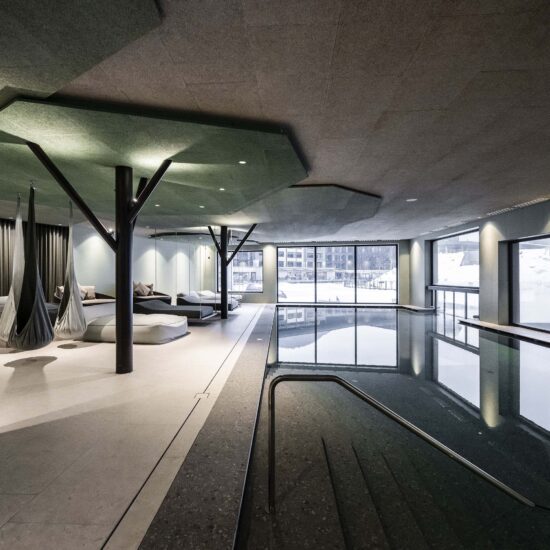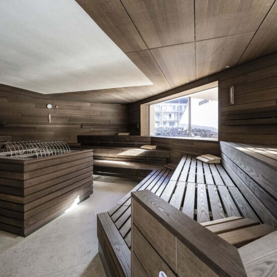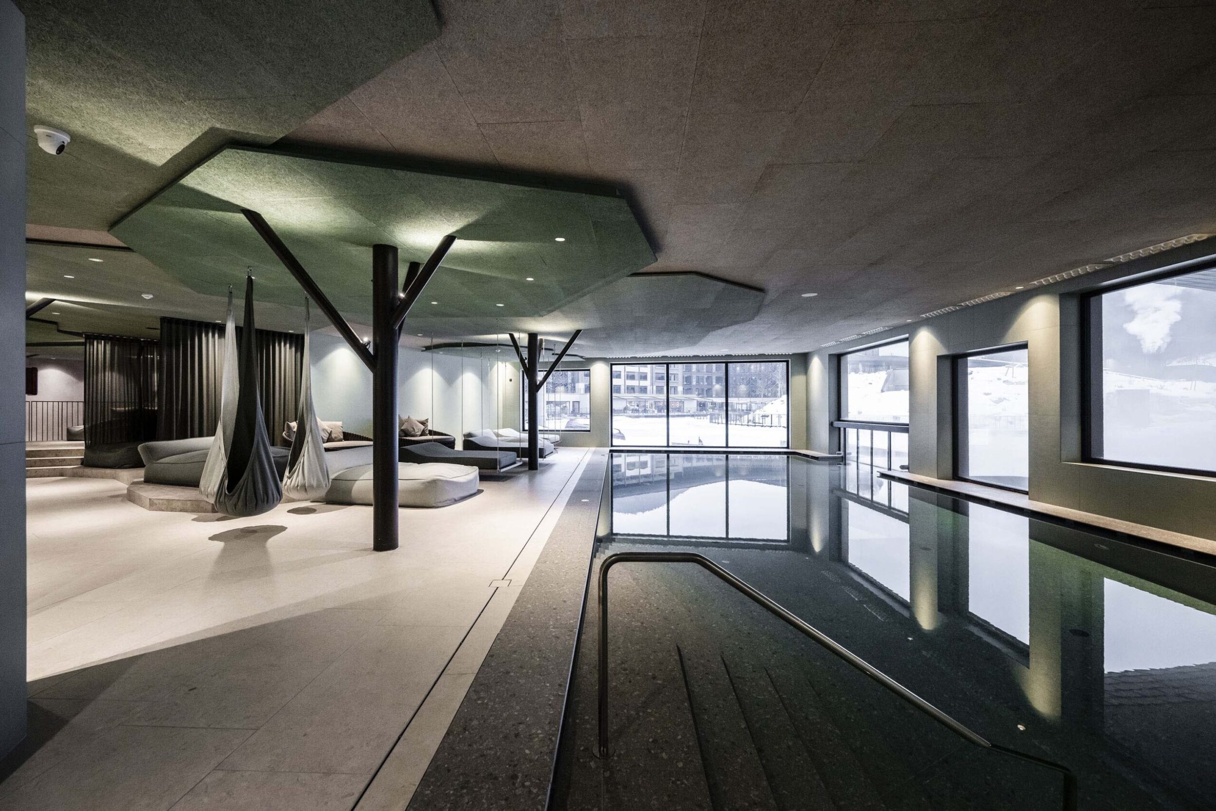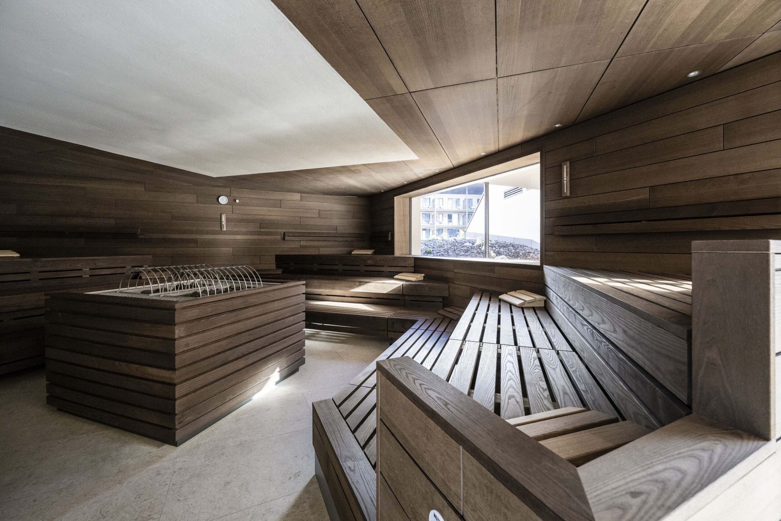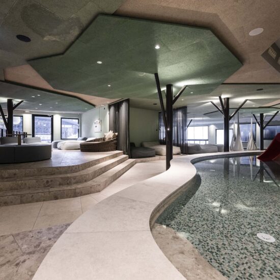 La grande piscine chauffée qui se prolonge à l'extérieur – et qui constitue un attrait très particulier en hiver – est revêtue de Realstone_Navigli en finition naturelle, un grès imitation pierre (30×60 cm), dont la surface est douce au toucher et parfaitement antidérapante grâce à la technologie de pointe, alors que pour l'extérieur, les architectes ont préféré la tonalité chaude et neutre de la variante Realstone_Jerusalem XT20 Noce, en format 50×100 cm et 20 mm d'épaisseur. Toujours à l'extérieur, les espaces communs voués à la relaxation sont habillés du sobre, élégant et ingélif grès cérame Season.