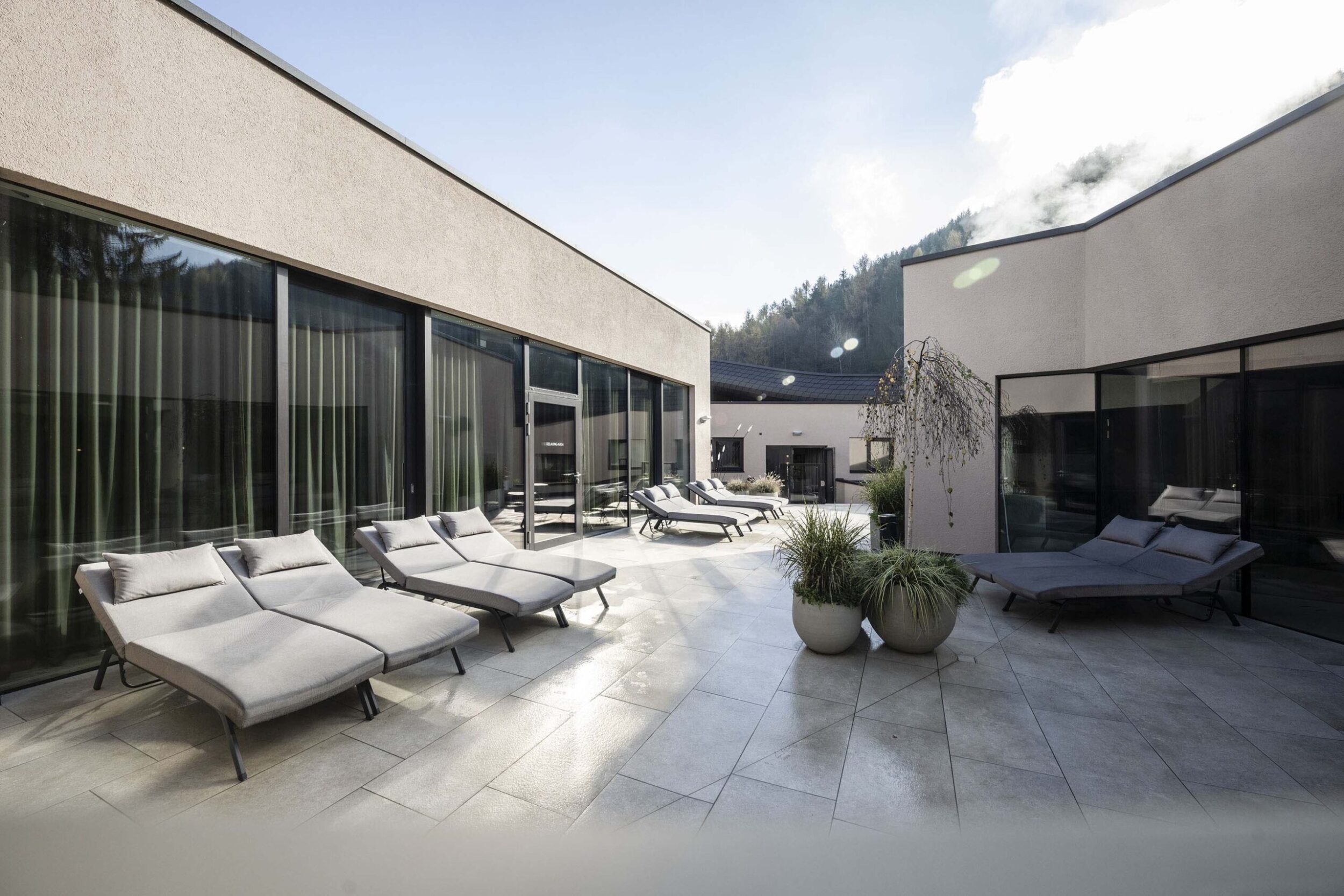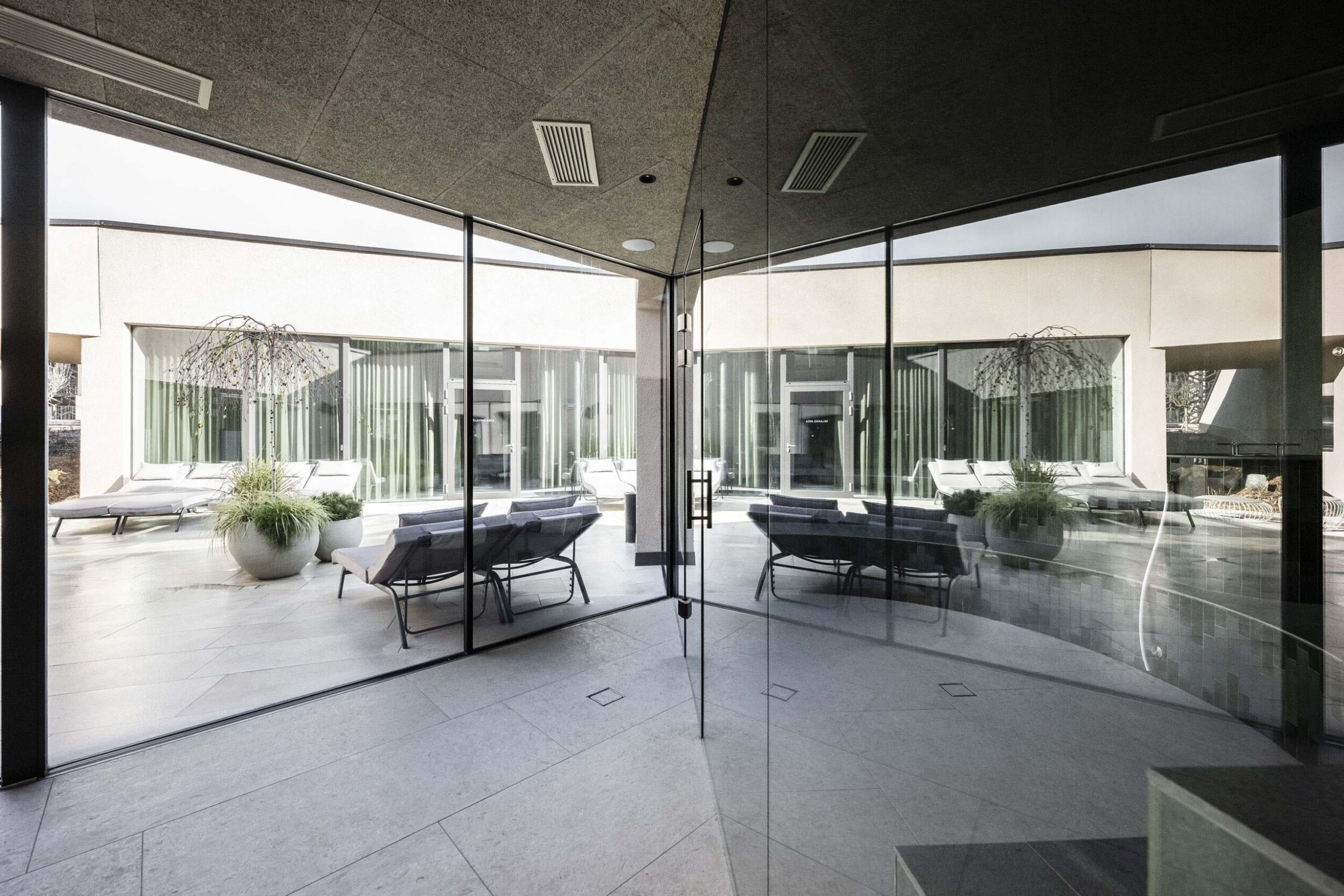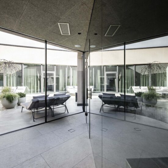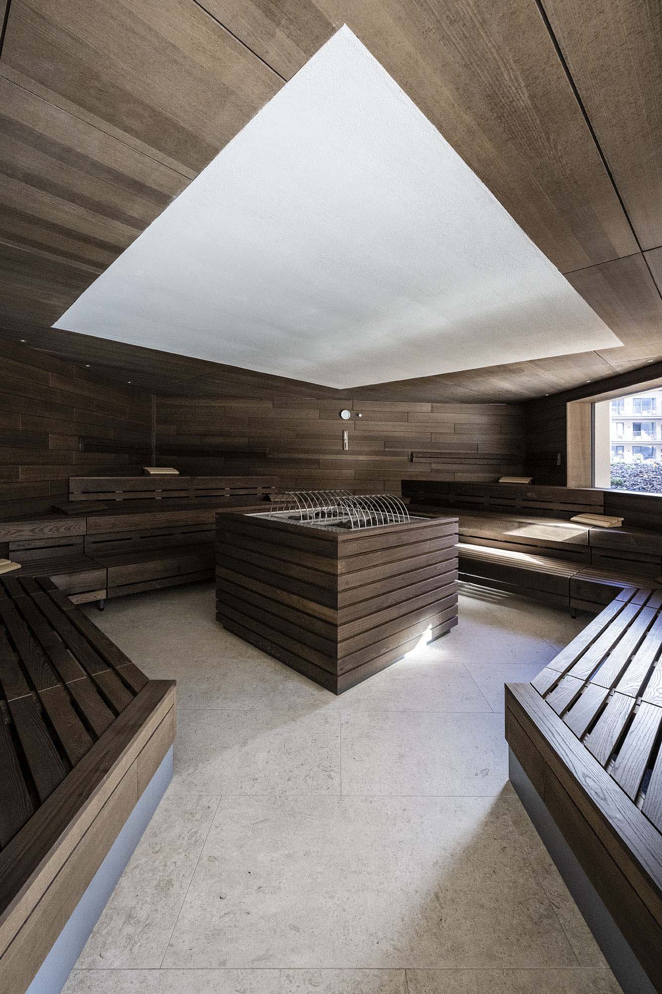 La grande piscine chauffée qui se prolonge à l'extérieur – et qui constitue un attrait très particulier en hiver – est revêtue de Realstone_Navigli en finition naturelle, un grès imitation pierre (30×60 cm), dont la surface est douce au toucher et parfaitement antidérapante grâce à la technologie de pointe, alors que pour l'extérieur, les architectes ont préféré la tonalité chaude et neutre de la variante Realstone_Jerusalem XT20 Noce, en format 50×100 cm et 20 mm d'épaisseur. Toujours à l'extérieur, les espaces communs voués à la relaxation sont habillés du sobre, élégant et ingélif grès cérame Season.