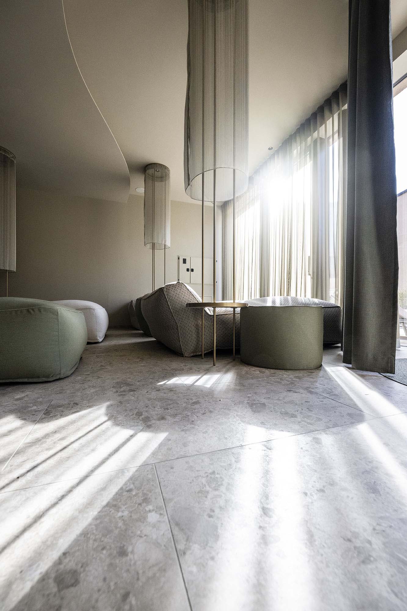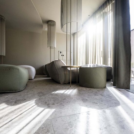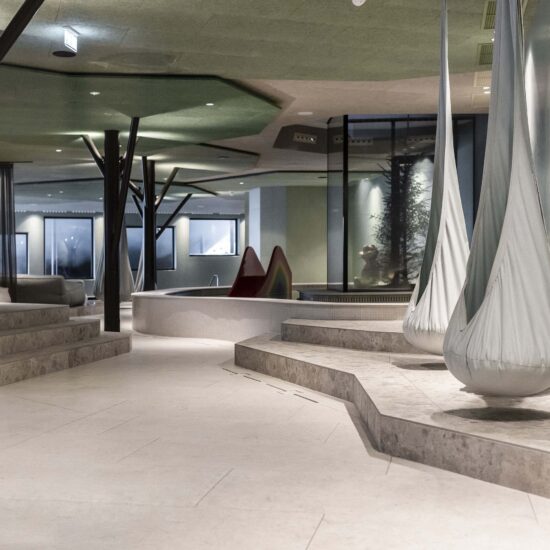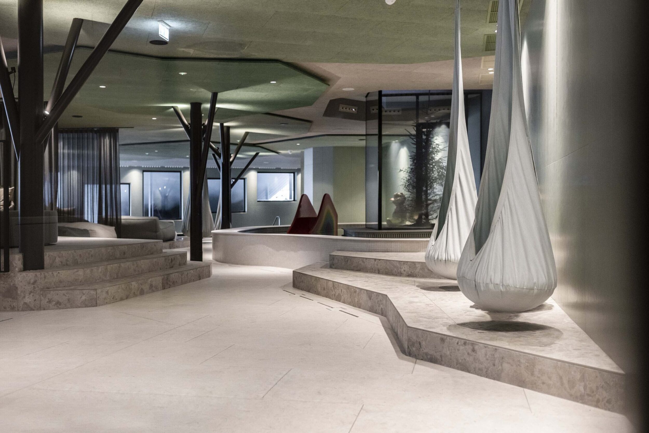 Dans ce lieu de villégiature qui accorde autant d'attention aux besoins de ses clients, impossible de faire sans une zone Wellness, ample et particulière, aménagée de colonnes/d'arbres qui font office de bois, ainsi que de fauteuils/nids accrochés au plafond : clins d'œil manifestes à la nature. Les propriétés antibactériennes, antidérapantes et la résistance des céramiques Ragno jouent ici un rôle essentiel. La collection Eterna imitation pierre est utilisée en long et en large dans les nombreuses textures, Arena, Mix Beige, Mix Gris, en continuité visuelle entre intérieur et extérieur.