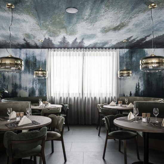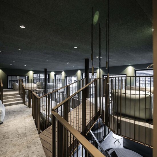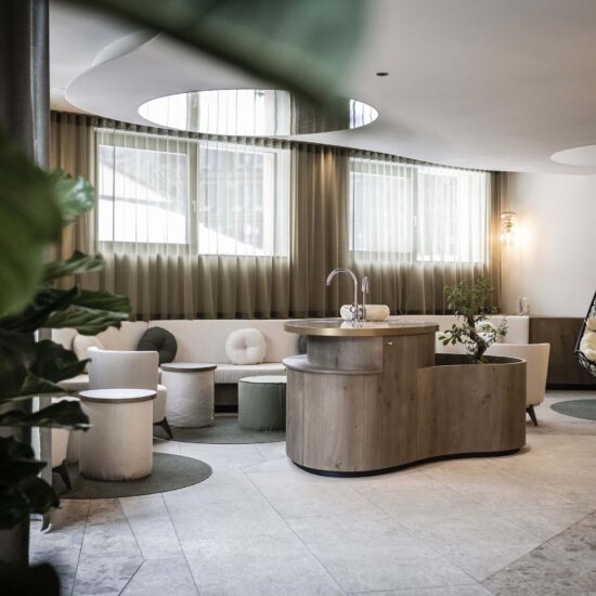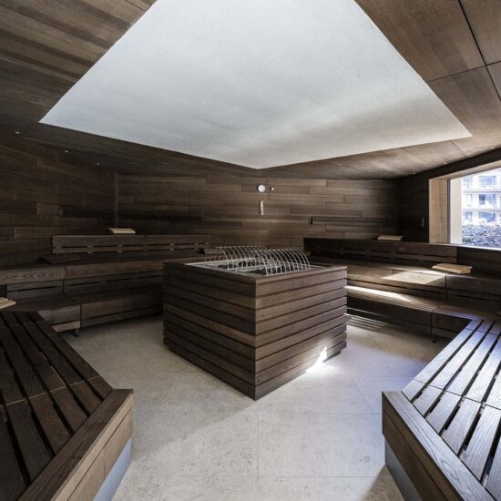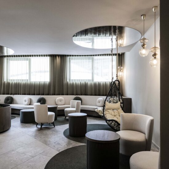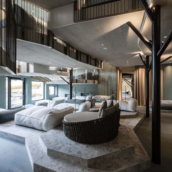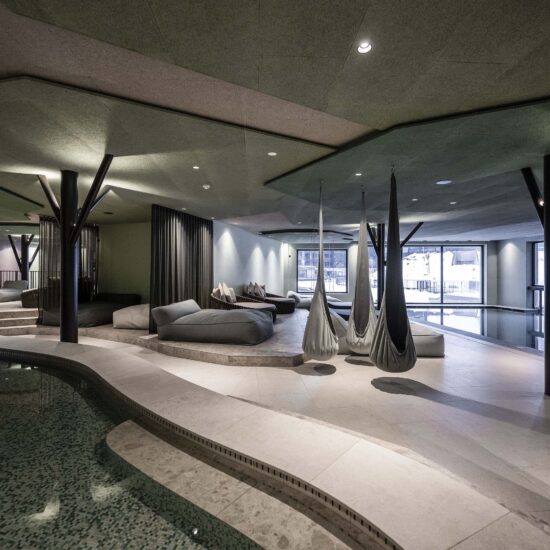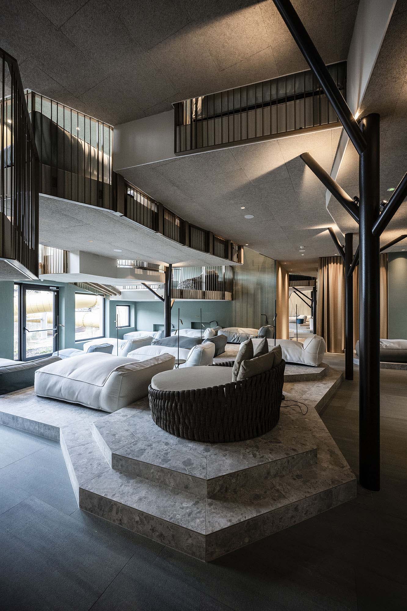 Dans ce lieu de villégiature qui accorde autant d'attention aux besoins de ses clients, impossible de faire sans une zone Wellness, ample et particulière, aménagée de colonnes/d'arbres qui font office de bois, ainsi que de fauteuils/nids accrochés au plafond : clins d'œil manifestes à la nature. Les propriétés antibactériennes, antidérapantes et la résistance des céramiques Ragno jouent ici un rôle essentiel. La collection Eterna imitation pierre est utilisée en long et en large dans les nombreuses textures, Arena, Mix Beige, Mix Gris, en continuité visuelle entre intérieur et extérieur.