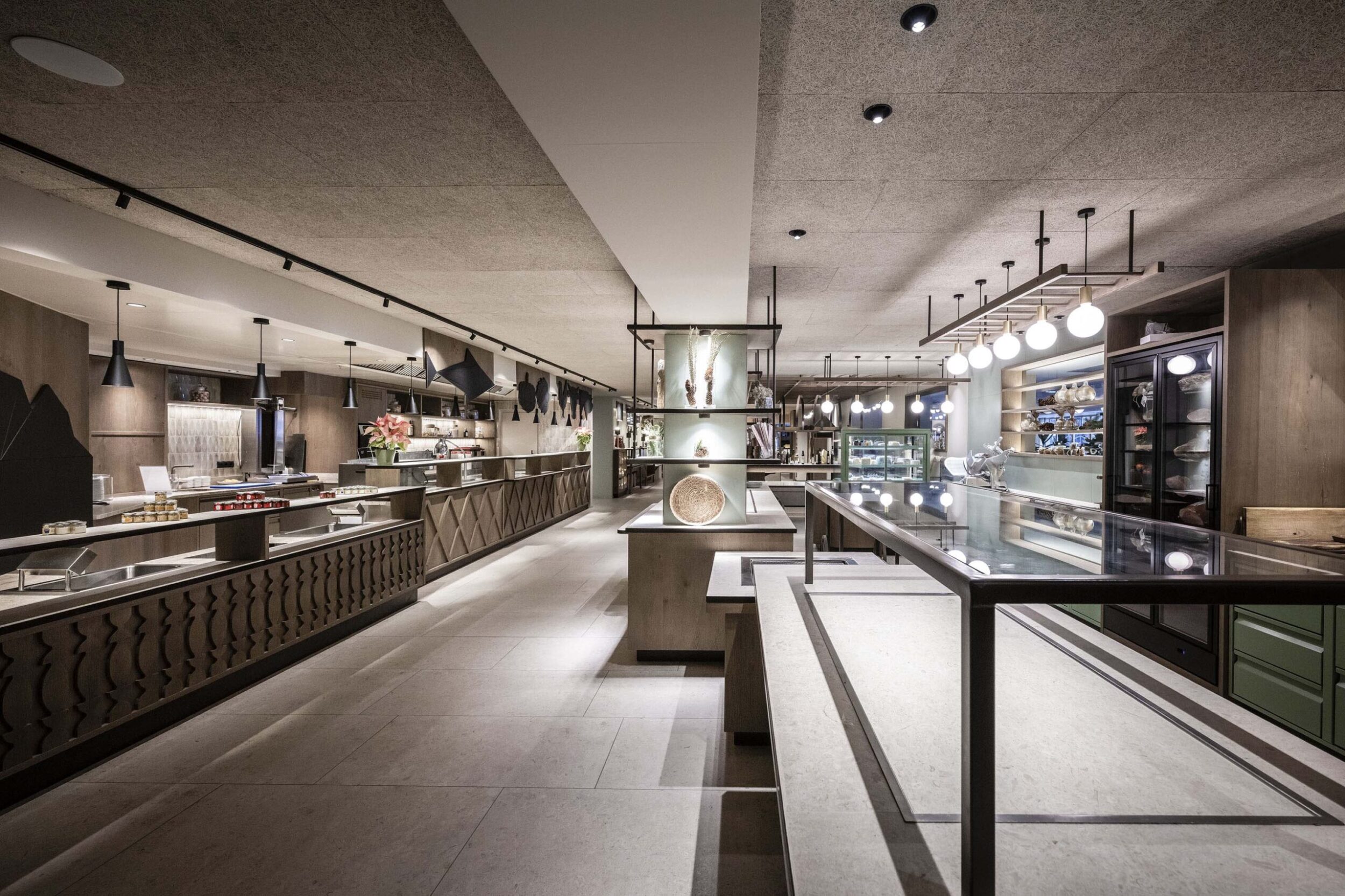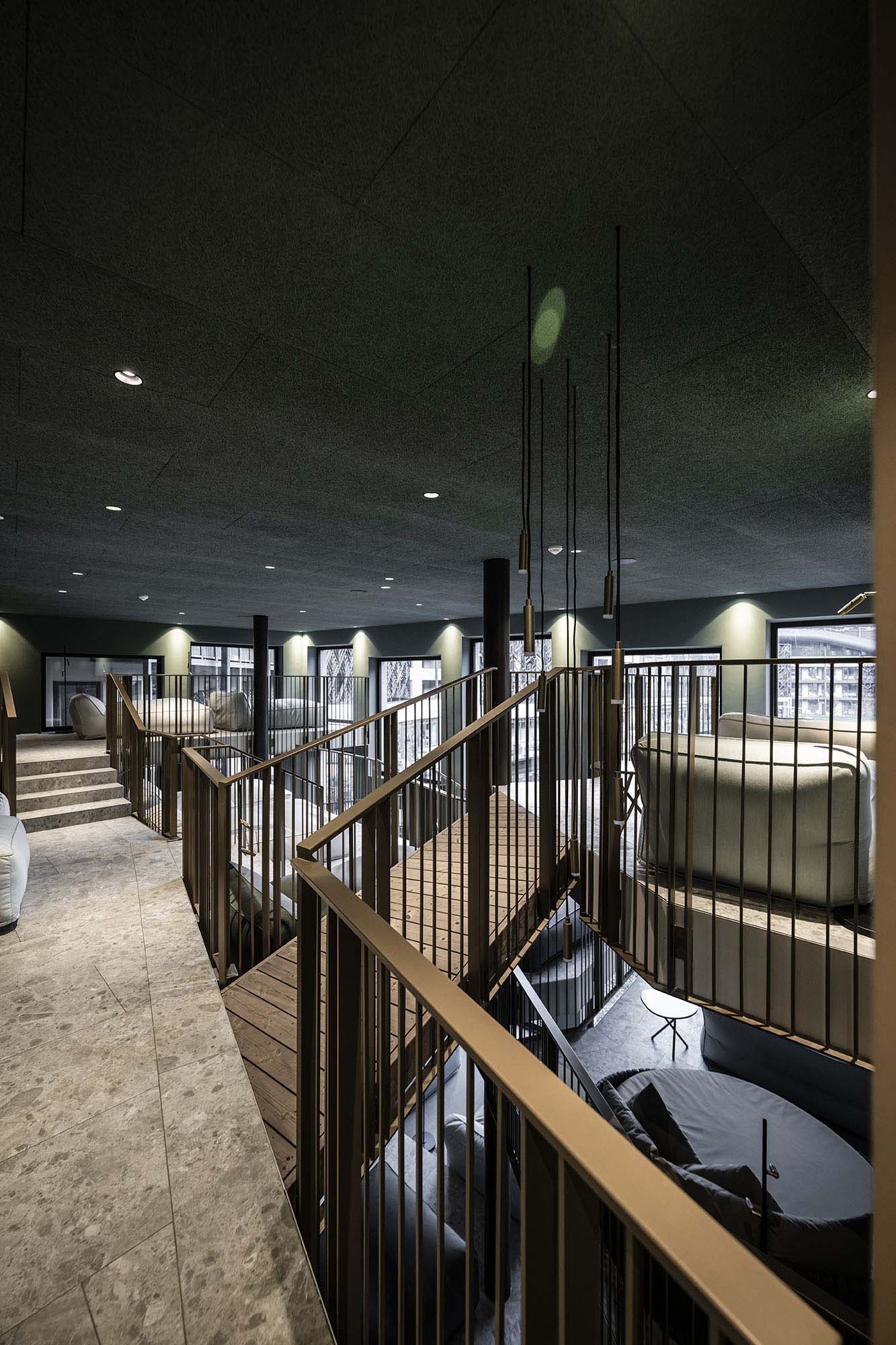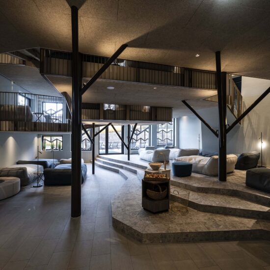 Pour uniformiser les éléments architecturaux anciens et neufs, le bureau a sélectionné une couleur unique pour les murs et des fantaisies géométriques en bois naturel qui font un clin d'œil aux anciennes granges alpines.