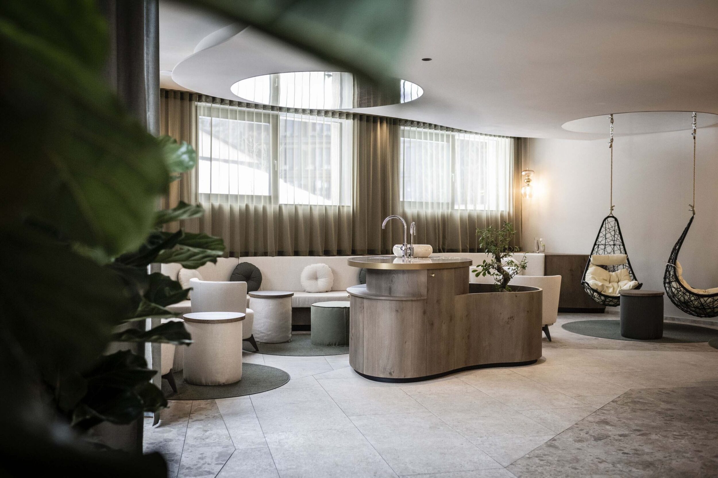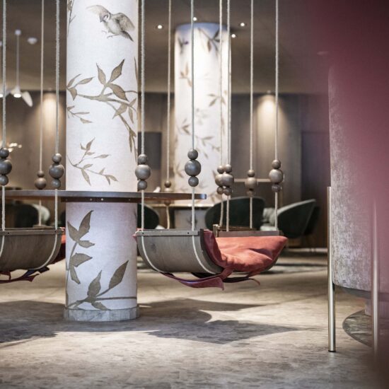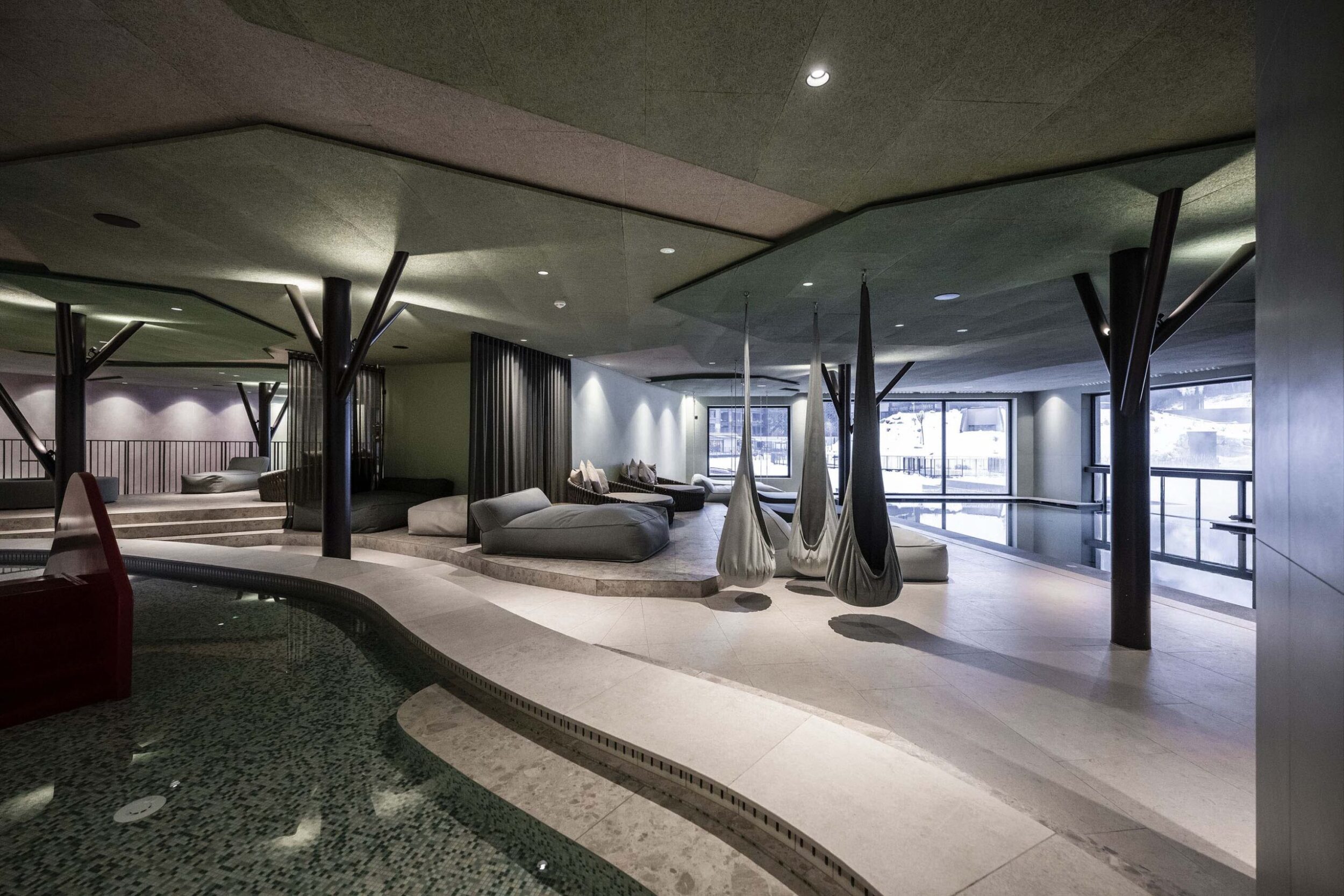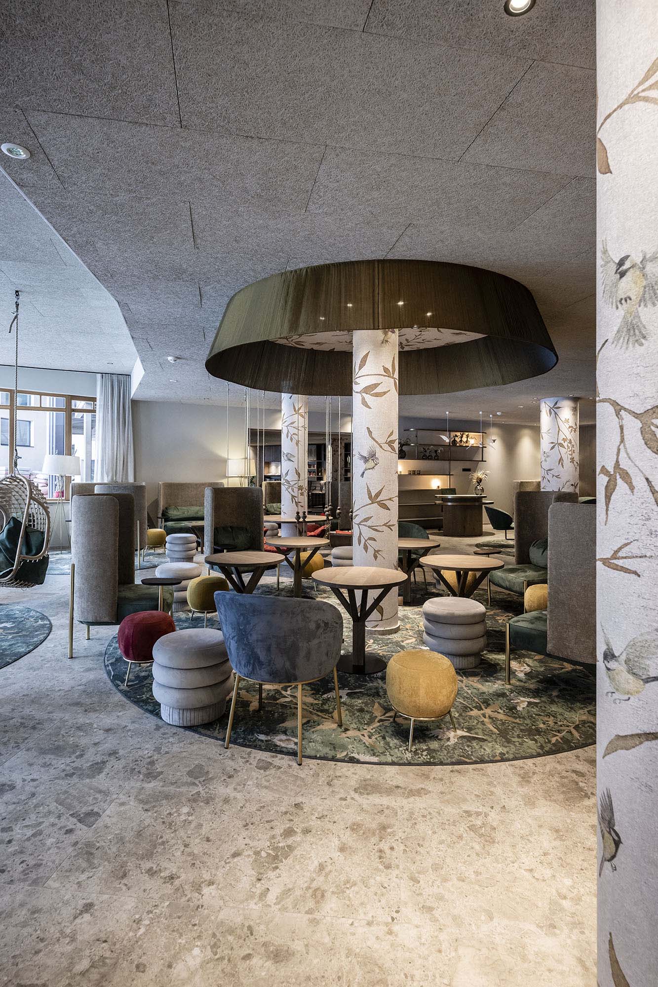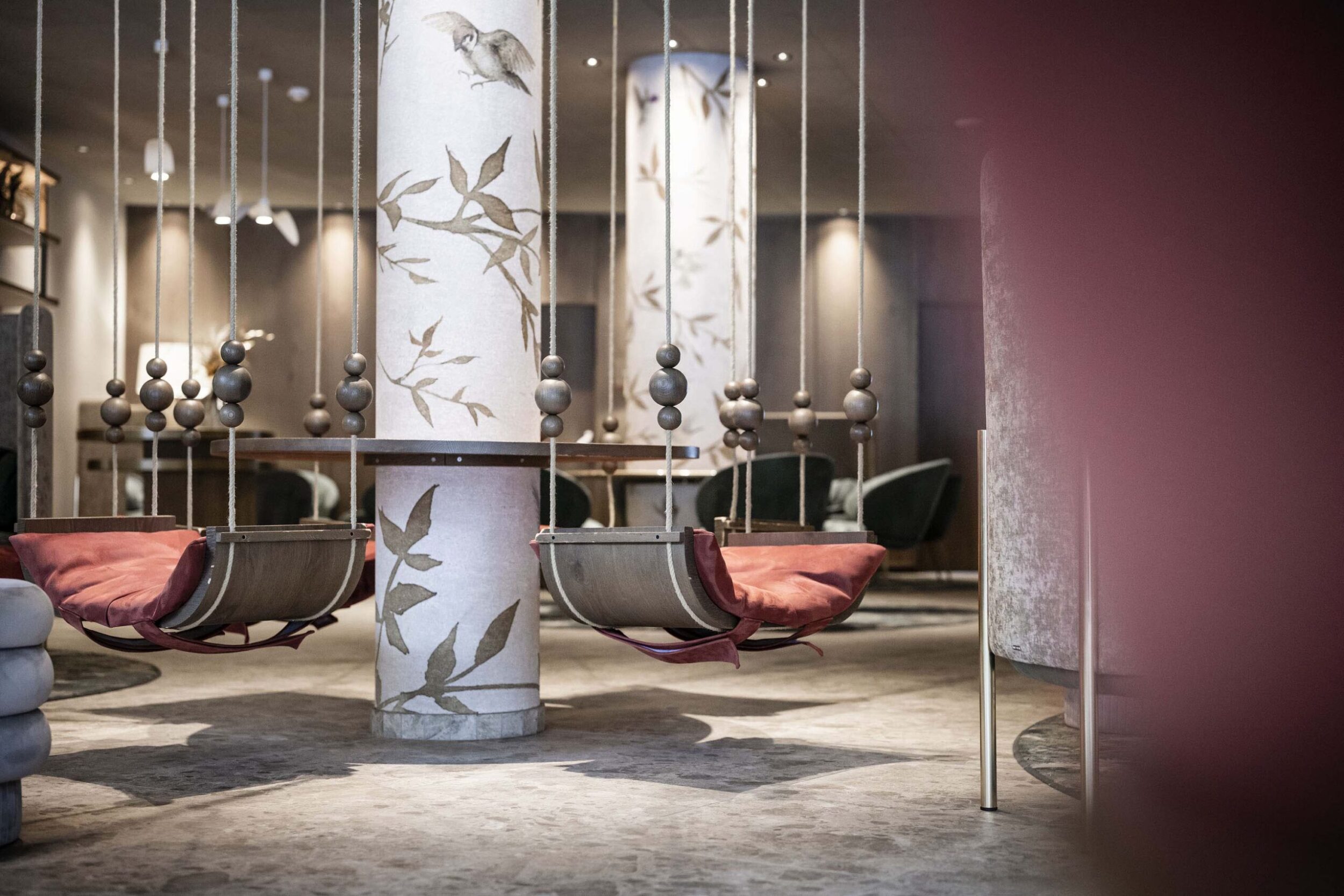 La logique se fait aussi sentir à l'intérieur où les petits peuvent s'amuser pendant que les parents se relaxent. Le concept apparaît très clairement déjà à la réception, avec des colonnes décorées qui rappellent les bois alentours, des jeux et des balançoires. Il en va de même dans les 36 nouvelles chambres, qui s'ajoutent aux 82 existantes, qui proposent des pièces communicantes avec zones séparées pour parents et enfants.