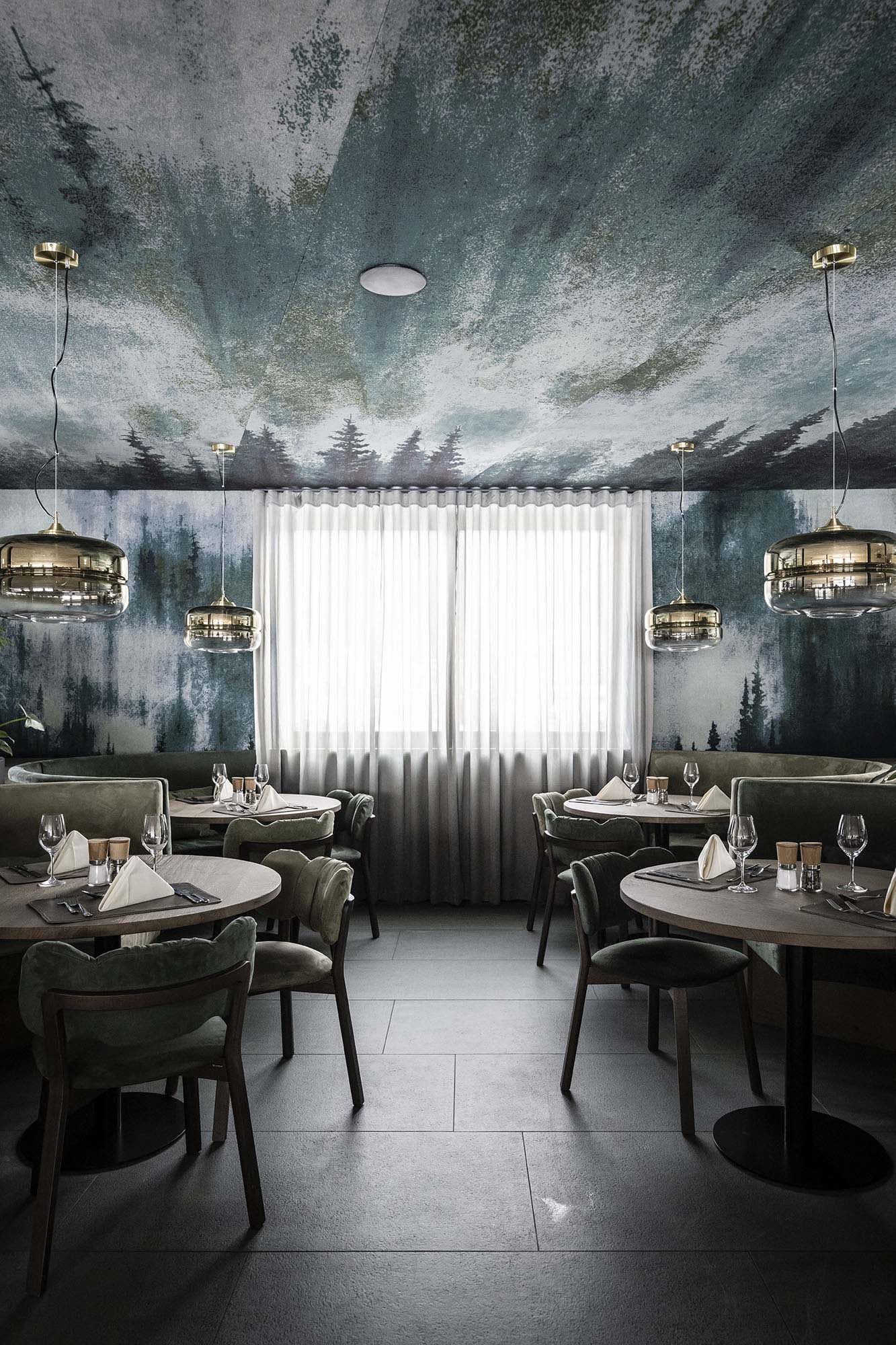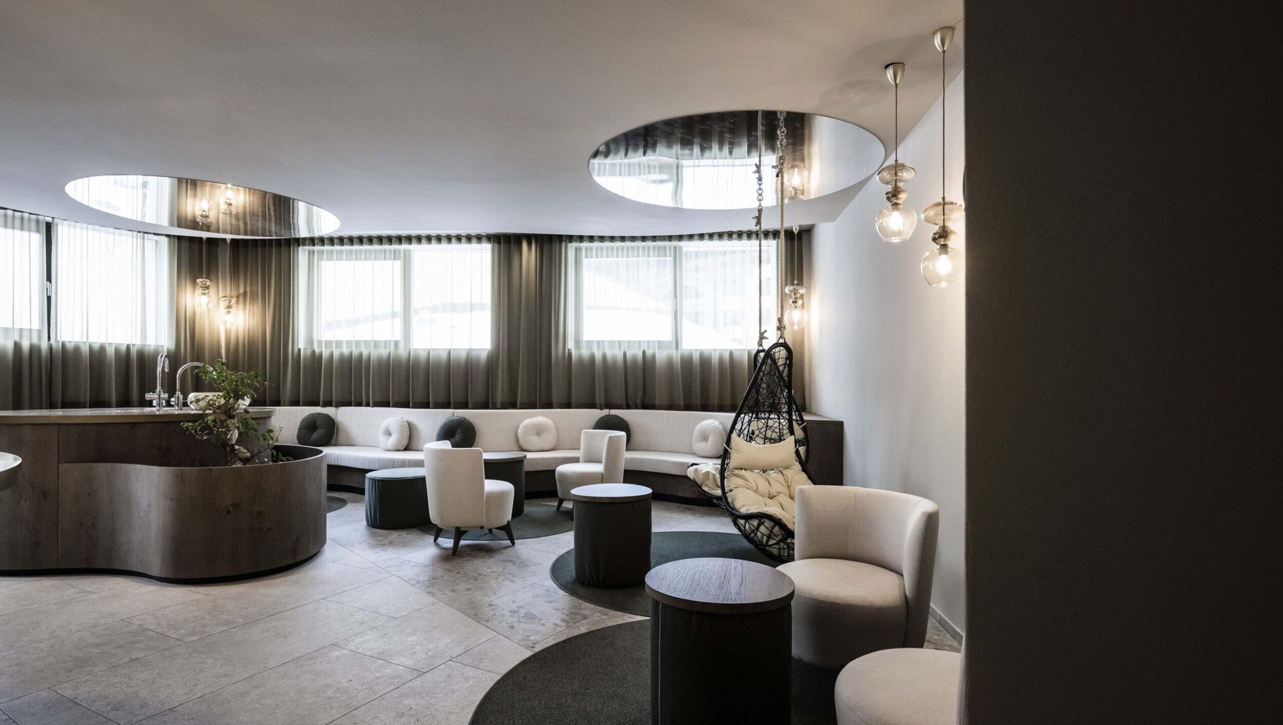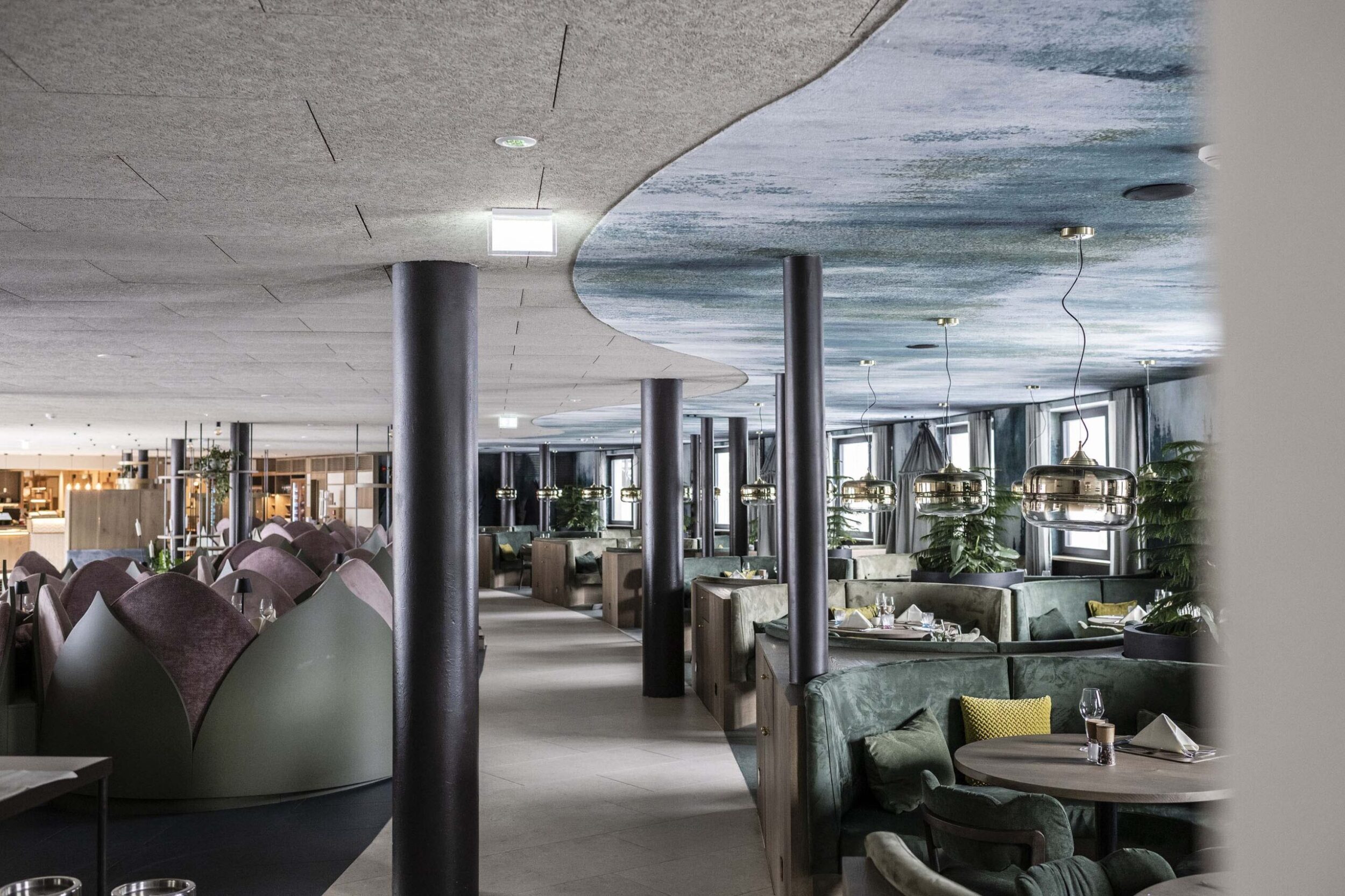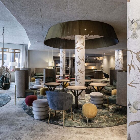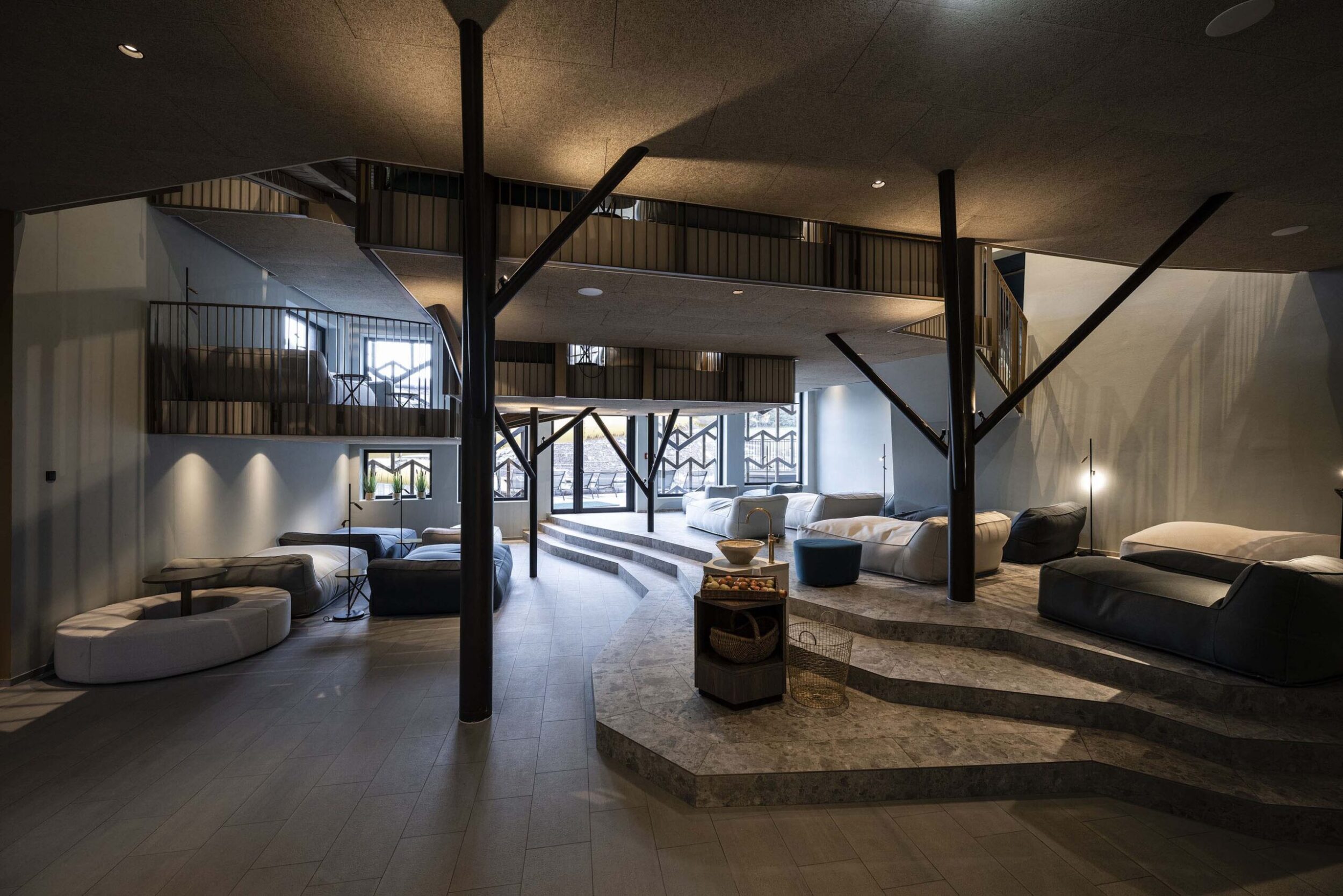 La logique se fait aussi sentir à l'intérieur où les petits peuvent s'amuser pendant que les parents se relaxent. Le concept apparaît très clairement déjà à la réception, avec des colonnes décorées qui rappellent les bois alentours, des jeux et des balançoires. Il en va de même dans les 36 nouvelles chambres, qui s'ajoutent aux 82 existantes, qui proposent des pièces communicantes avec zones séparées pour parents et enfants.