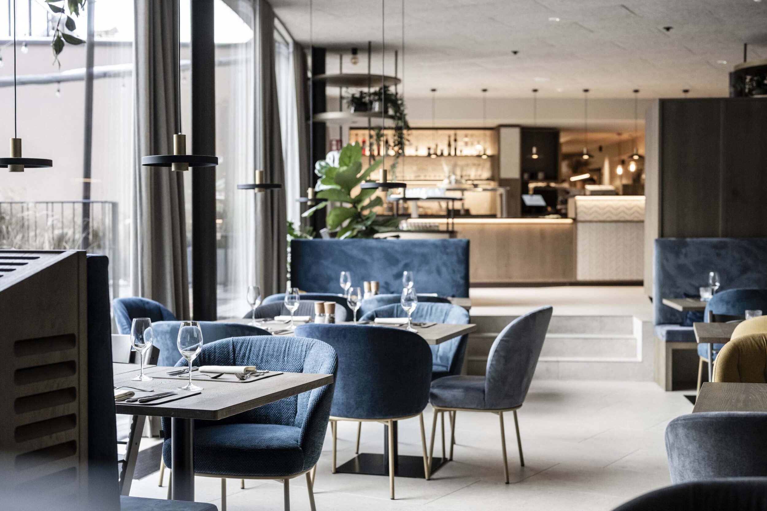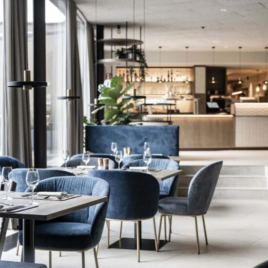 Sur le sol, Eterna Arena a été sélectionnée non seulement pour le naturel de son imitation pierre, mais aussi pour son traitement CleanOut Antibacterial Protection, la technologie antibactérienne de Ragno qui garantit des propriétés d'hygiène et de salubrité par l'intégration d'ions argent pendant la fabrication. La zone des tables, quant à elle, est délimitée par l'effet béton de la texture légèrement mouvementée et mate du grès cérame Stratford dans un rassurant Blue (60×60 cm).