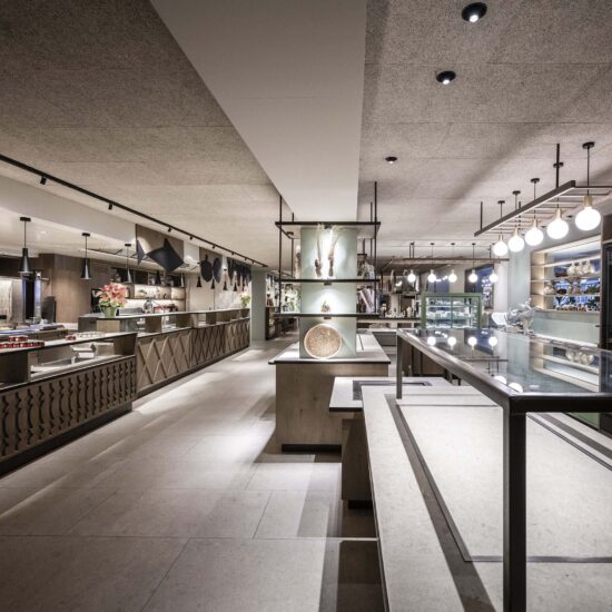 Dans les différentes applications, les associations de couleurs entre les surfaces céramiques contribuent à instaurer une atmosphère de détente et, par conséquent, à susciter une sensation de bien-être aux clients. Dans le coin restaurant – agrandi et flanqué d'une terrasse avec aire de jeux, structuré sur trois étages pour que tous profitent de la vue sur le lac, avec un mobilier inspiré de la nature alentours -, le grès est décliné dans les différentes collections, témoignant ainsi de la transversalité, de la multiplicité et de la fonctionnalité des solutions Ragno.