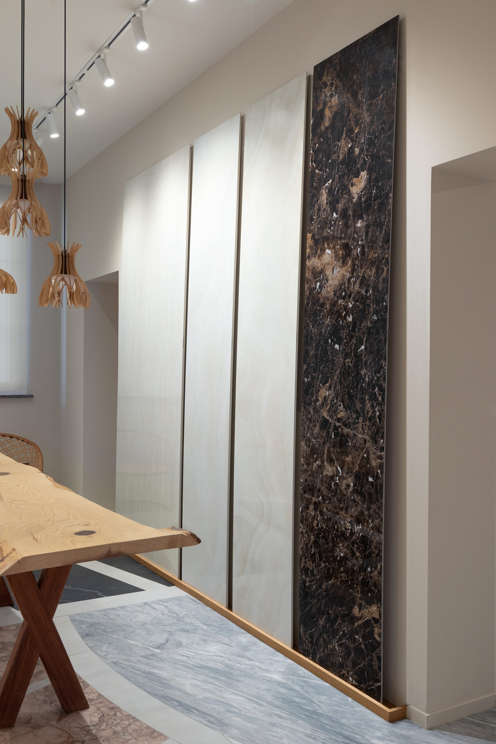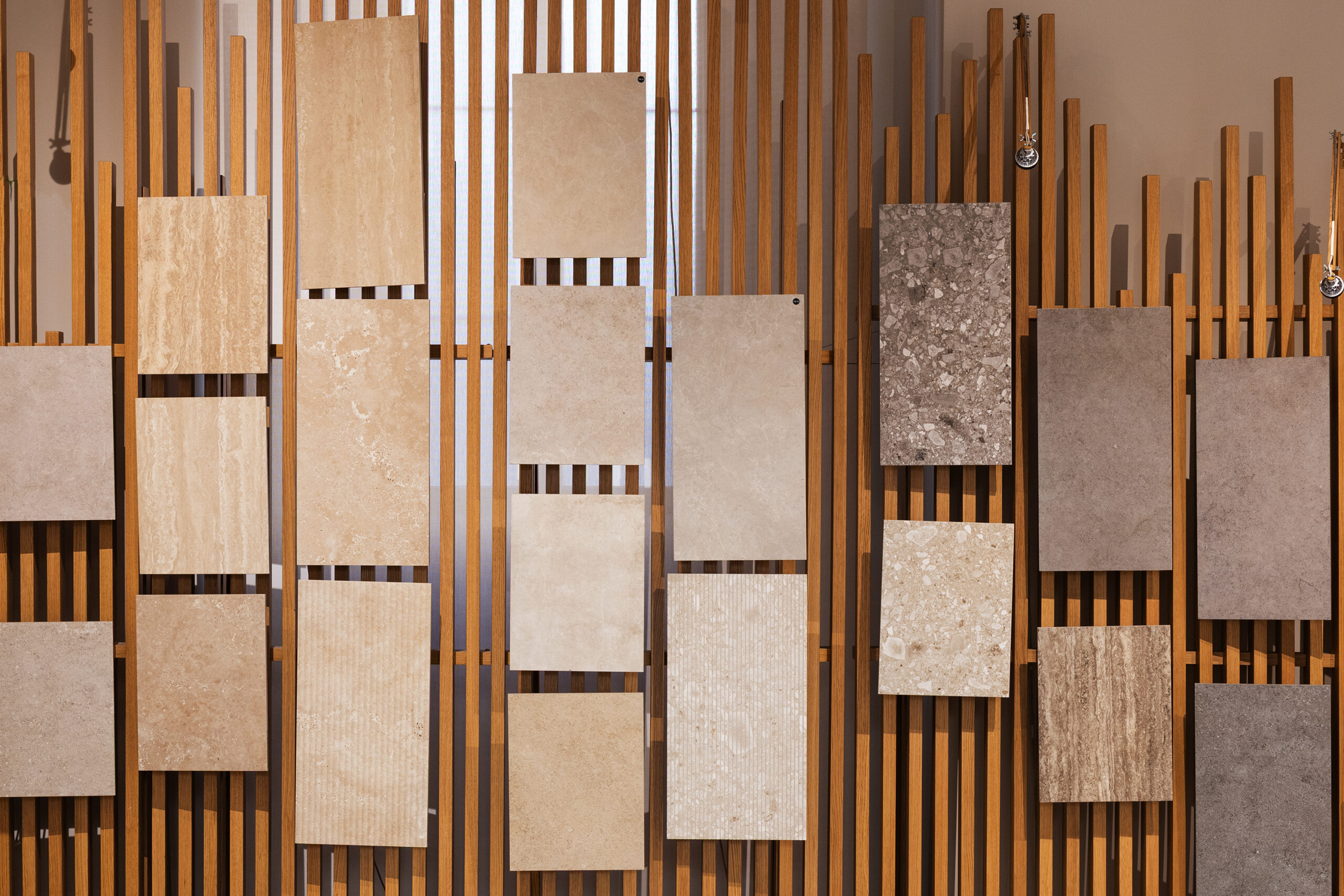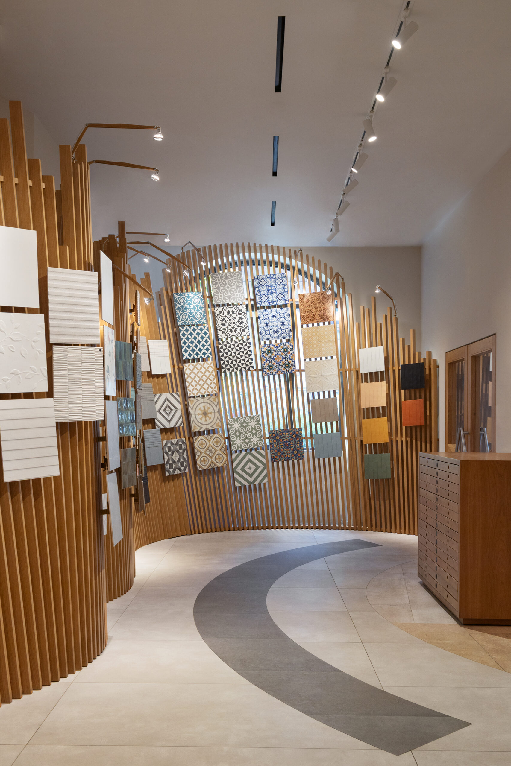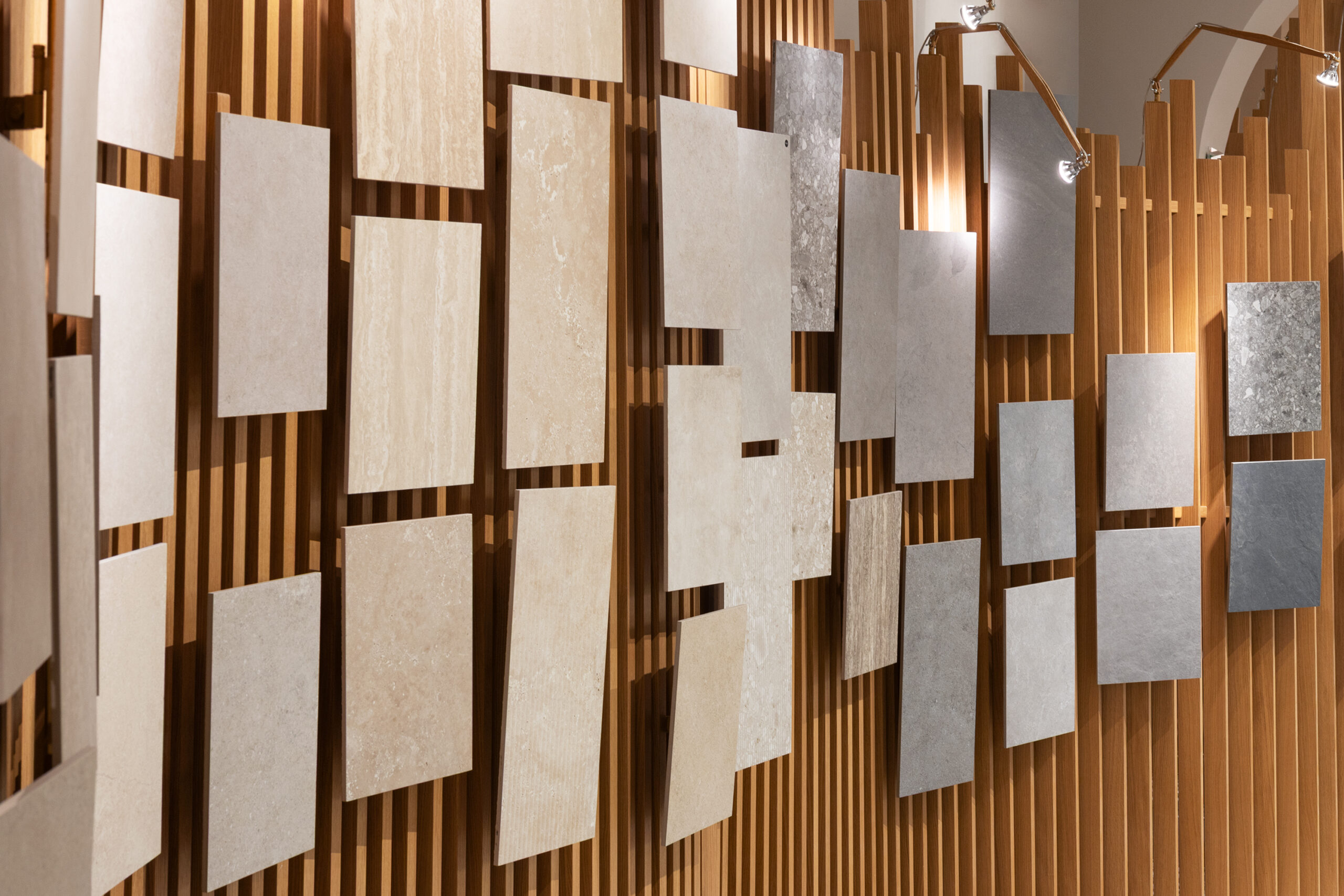 Le parcours est complété par Hand, le nouveau revêtement mural qui rappelle l’esthétique des murs enduits et talochés, où la surface devient geste, signe et substance.