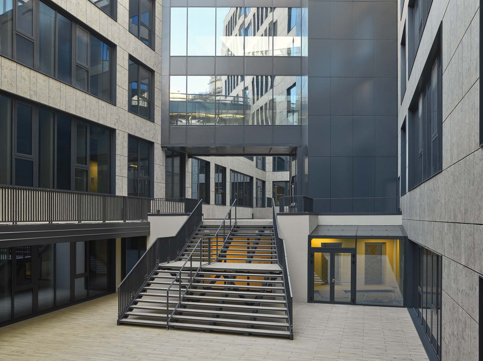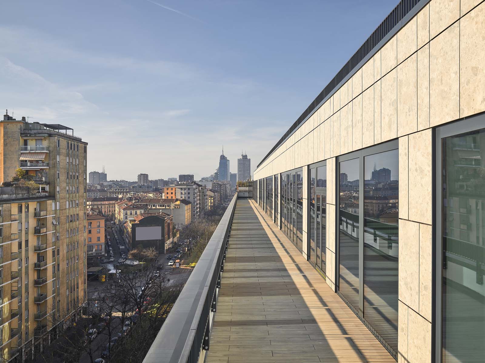Le bâtiment intègre également les principes de biophilie dans la configuration des espaces de travail : les grandes terrasses deviennent des extensions des espaces de travail, reconnectant l’individu avec l’environnement naturel ; la cour rénovée, sur deux niveaux interconnectés, se configure comme une véritable agora, un lieu protégé où développer des relations sociales.