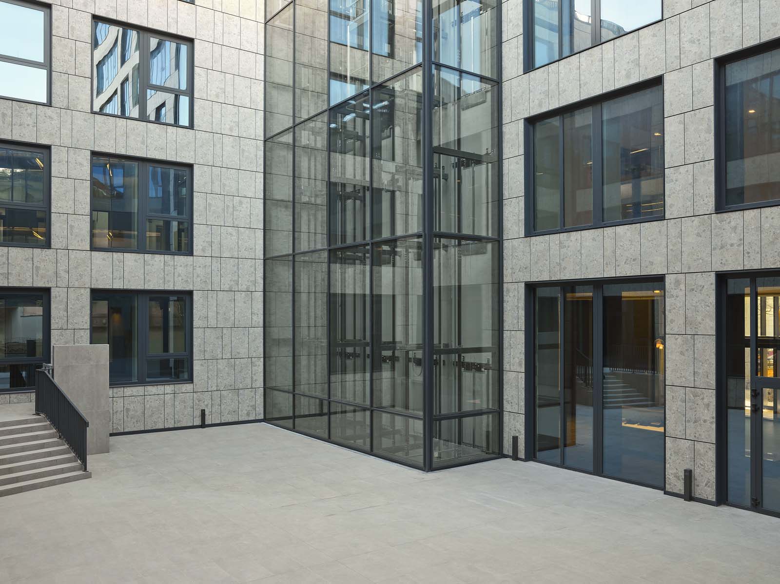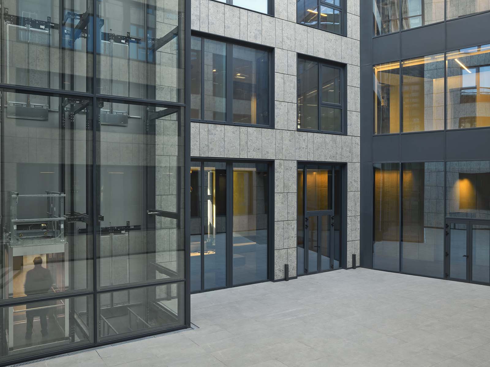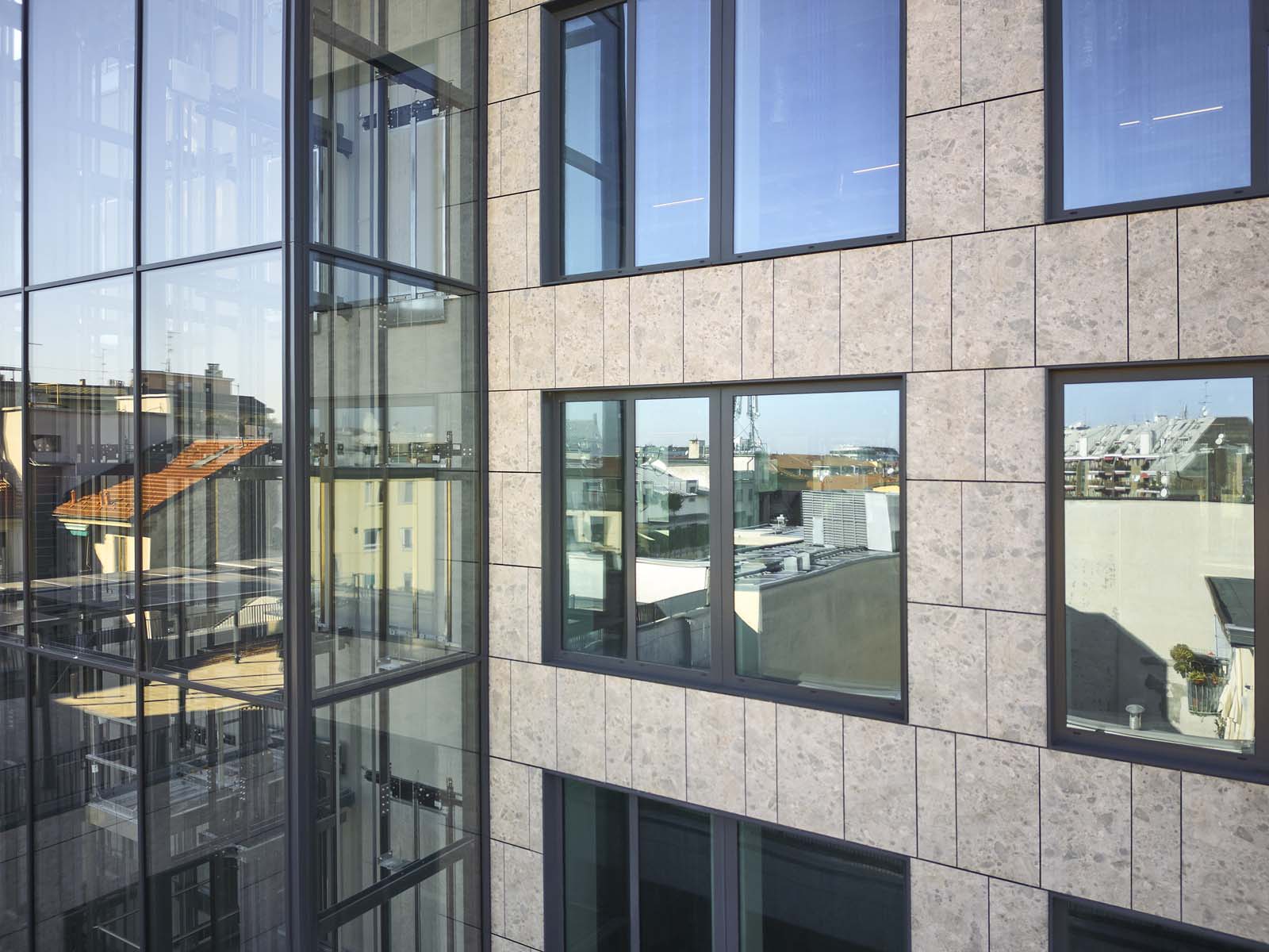 Les surfaces de la nouvelle façade ventilée, correctement isolée, ont été revêtues de porcelaine effet pierre Eterna Mix Gris, rappelant matériellement la base du numéro 27. Pour la façade du numéro 27, le projet prévoyait la conservation intégrale des éléments du langage architectural.