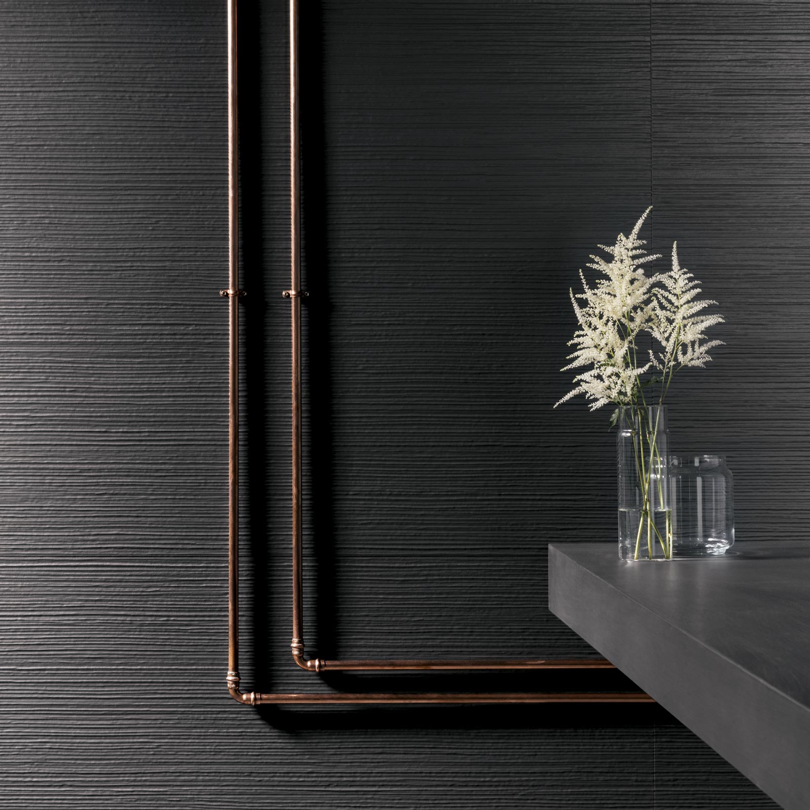 Pour autant, la collection Tactile s'inscrit pleinement dans le monde contemporain : à travers les couleurs Titanio et Carbone, sa structure Resina 3D, son décor Shine et la mosaïque Bone, la chaleur du foyer embrasse la géométrie et la rigueur, évoquant un souci extrême du détail et une modernité fidèle à son lien avec le passé.