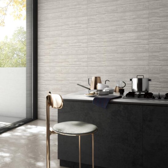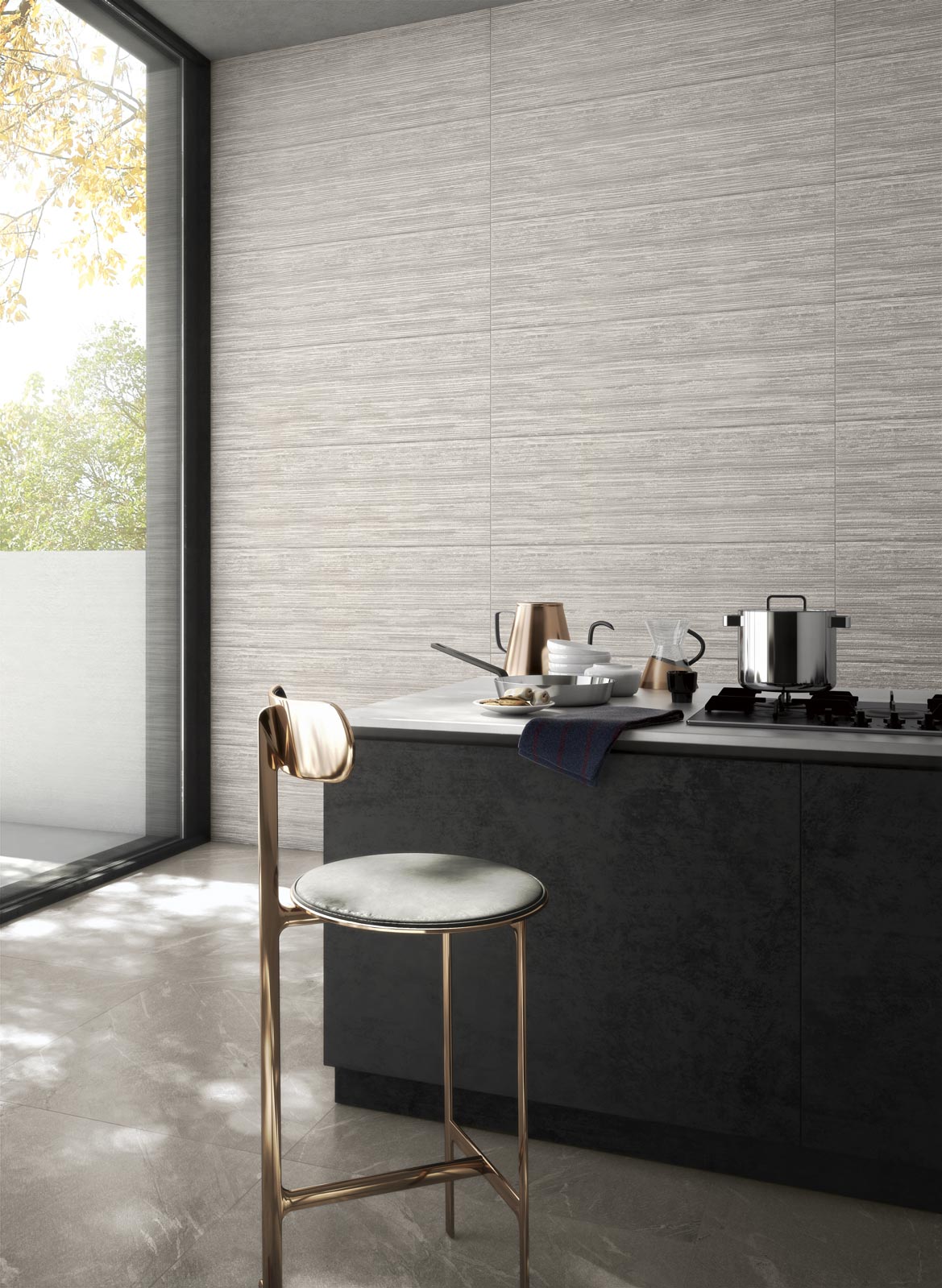Un format unique de carreaux de fine épaisseur rectifiés en céramique, 40×120 cm, et en modules carrés de 40×40 cm uniquement pour les mosaïques, qui module la texture superficielle : le toucher, indissociable de la mémoire, devient ainsi le véritable protagoniste de l'interprétation de la matière et de ses évocations.