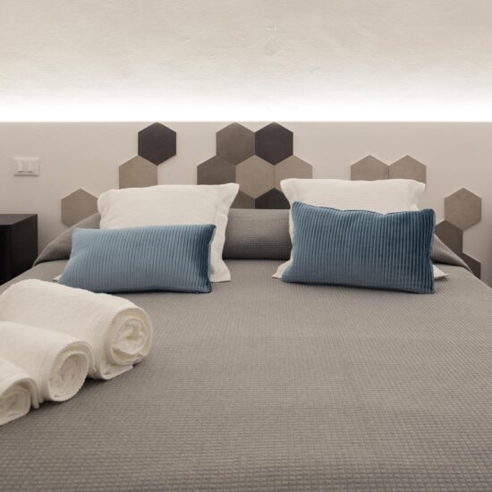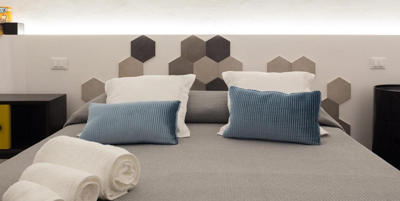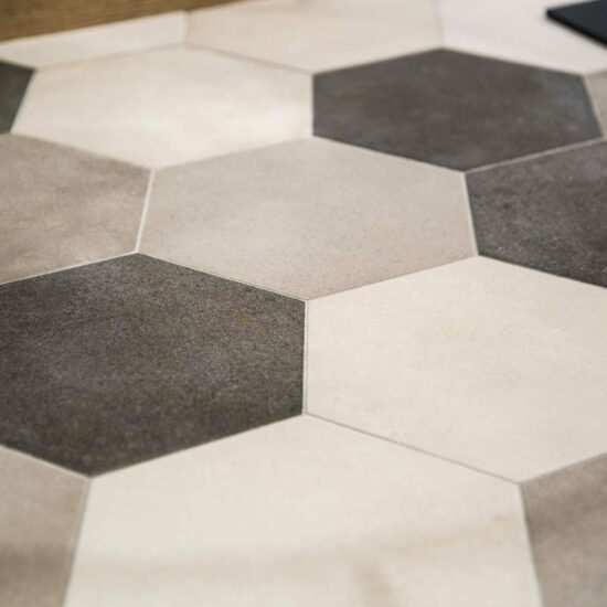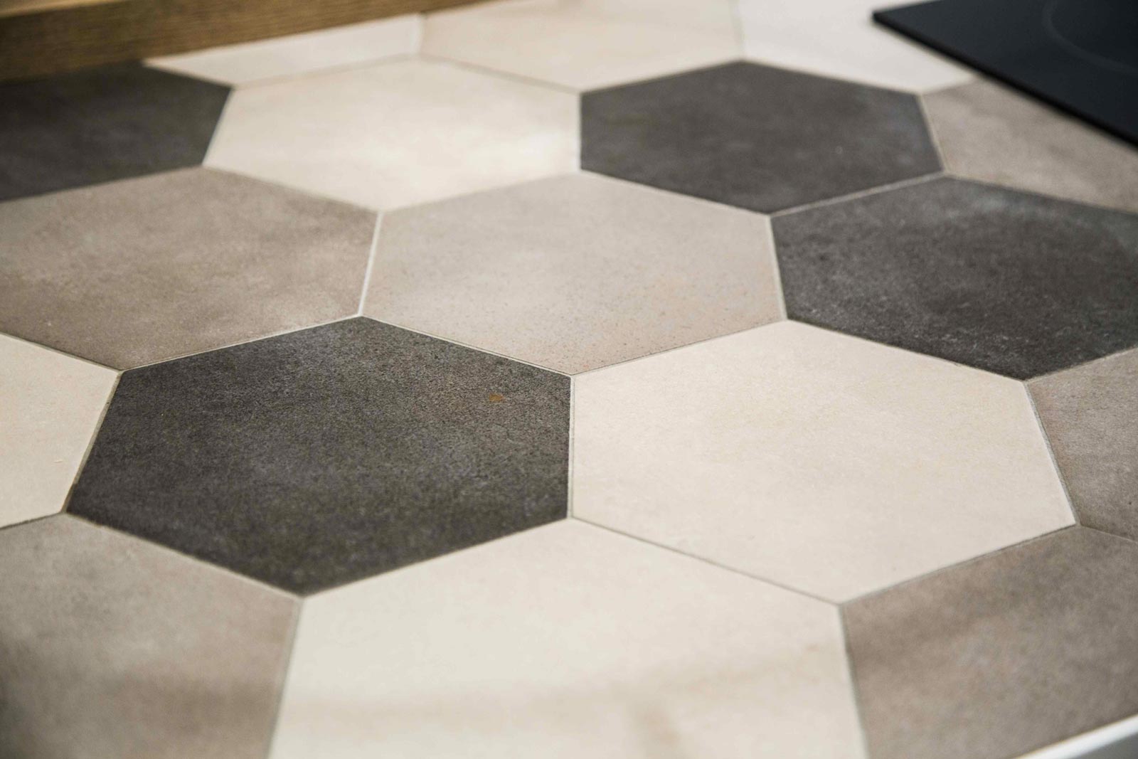 Dans le premier cas, les carreaux ont été posés sur le sol, dans le second cas comme plan de travail de l'îlot, et dans le troisième en guise de tête de lit, prouvant ainsi l'extraordinaire souplesse d'emploi du grès cérame imitation ciment, choisi ici dans les couleurs Vanilla, Polvere et Peltro, et dans le format hexagonal qui fait aujourd'hui très tendance.