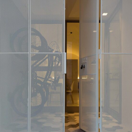 L'intérieur est un open-space unique qui conserve les dimensions de la boutique d'origine, et les différentes fonctions ont été agencées de façon linéaire depuis l'extérieur vers l'intérieur, dissimulant à la vue les zones réservées à la relaxation et à l'intimité.