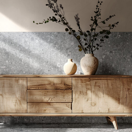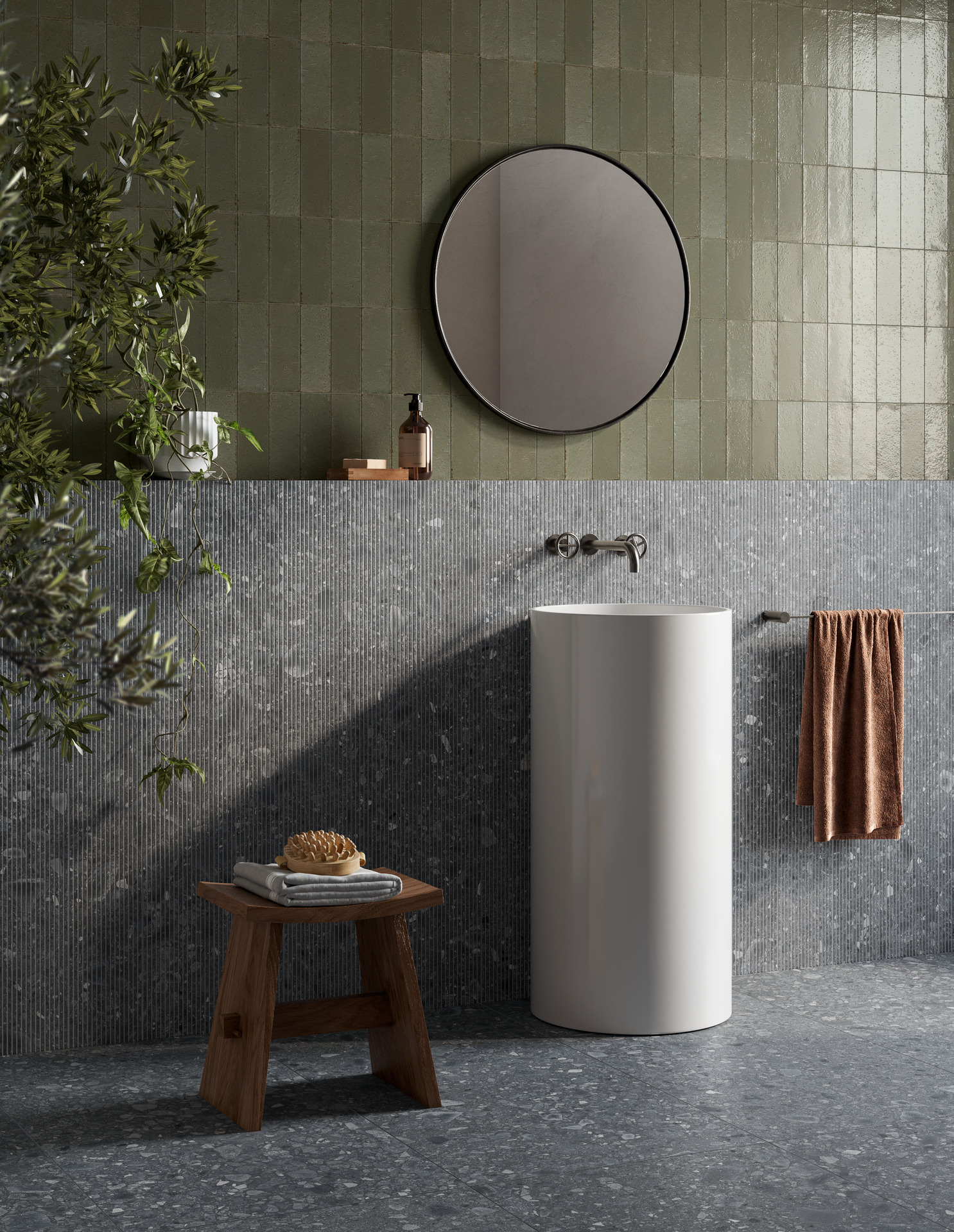 La palette de couleurs résolument contemporaine donne à la collection un charme idéal pour les projets résidentiels. Les décorations de Realstone_Ceppo, déclinées dans les quatre coloris, mettent particulièrement le produit en valeur sur les murs, grâce à des poses en boiserie réalisées avec le Listel Preinciso au format 13,5×120 cm – caractérisé par une gravure en surface avec un espacement très fin qui anime le graphisme. Les joints peuvent également être remplis avec des couleurs contrastantes pour des effets chromatiques vraiment originaux.