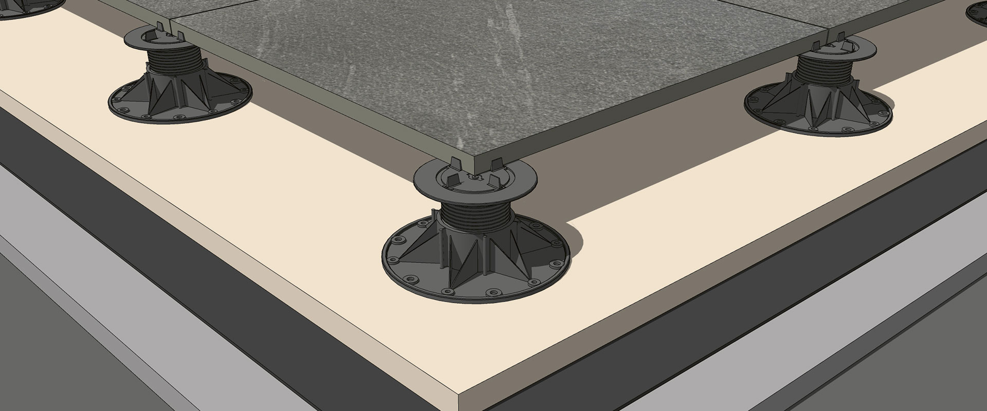 • Pour améliorer l’isolation thermique et la performance énergétique, il est possible d’ajouter des panneaux thermo-isolants de densité appropriée, directement entre la couche d’imperméabilisation et les plots réglables du plancher surélevé.